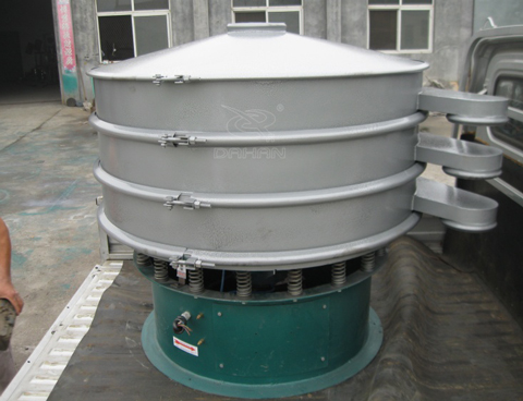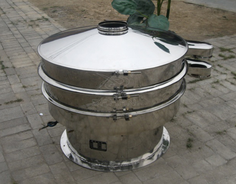 Φ1000型振動篩為直徑1000mm的兩層三個出料口振動篩,子母網分離式網架,接觸物料部分以及防塵蓋均為304不鏽鋼材質,底座部分為Q235碳鋼材質。