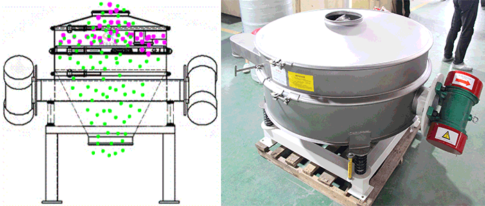 旋振篩,由單台立式振動電機作激振源,電機上、下兩端安裝有偏心重錘,將電機的旋轉運動轉變為水平、垂直、傾斜的三次元運動,再把這個運動傳遞給篩麵,使物料在篩麵上做外擴漸開線運動,故該係列振動篩稱之為旋振動篩。