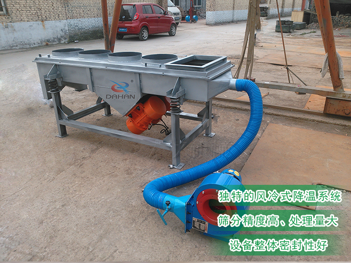 風冷式直線振動篩以DZSF係列直線振動篩為基礎,增加了風機降溫冷卻係統,可將高溫物料降溫後繼續篩分,有效的降低高溫物料的篩分難度,篩分效率、處理量也得到了大幅度的提高,節約生產成本。