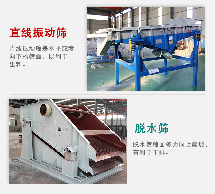 脫水篩篩麵多為向上爬坡,有利於幹排;直線振動篩是水平或者向下的篩麵,以利於出料。