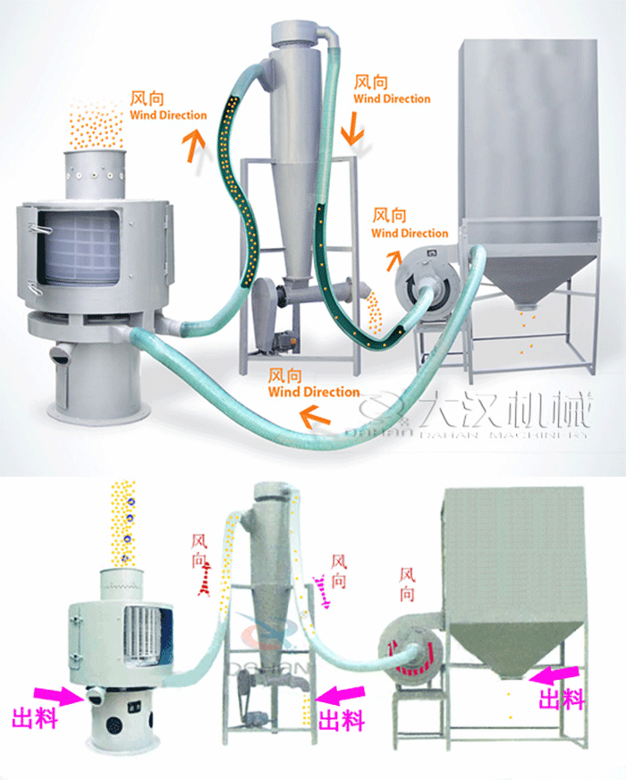 氣流篩由電機、機座、篩箱、進出料推進裝置等部分組成的。其篩網為圓筒狀,置於機體內,作業時物料不是直接投放到篩體內,而是經由一截螺旋輸送機送入,篩箱內的分流葉片高速連續轉動,將送入的物料吹起衝向圓筒狀的篩網,細料透過篩網進入成品儲料室,粗料從出料口流出。