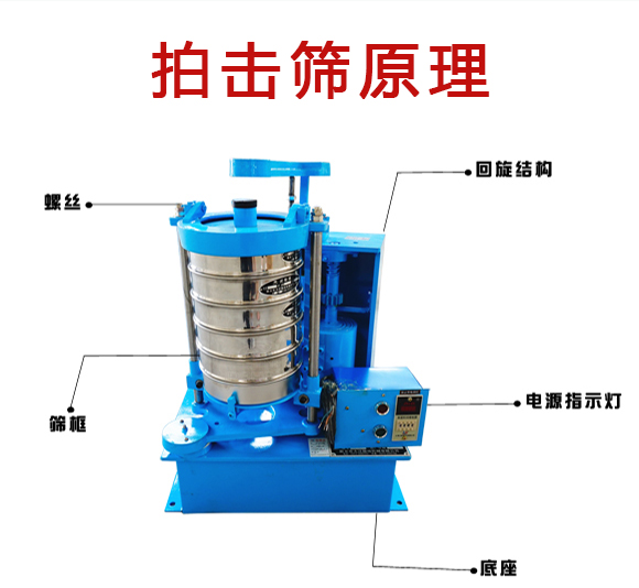 拍擊篩:拍擊篩 電dian機ji通tong過guo同tong步bu帶dai,帶dai動dong齒chi輪lun變bian速su後hou使shi主zhu軸zhou轉zhuan動dong,主zhu軸zhou帶dai動dong偏pian心xin輪lun使shi滑hua板ban帶dai動dong試shi驗yan篩shai左zuo右you搖yao動dong,同tong時shi帶dai動dong頂ding杆gan齒chi輪lun轉zhuan動dong,頂ding擊ji拍pai錘chui,拍pai擊ji試shi驗yan篩shai,使shi試shi驗yan篩shai、分樣篩中的物料篩分。