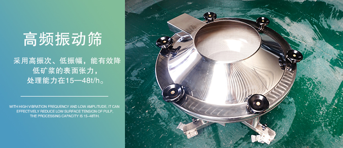 高頻振動篩采用高振次、低振幅,能有效降低礦漿的表麵張力,有利於細、重物料的析離分層而加快細、重物料透篩入料濃度在30%—40%,處理能力在15—48t/h。
