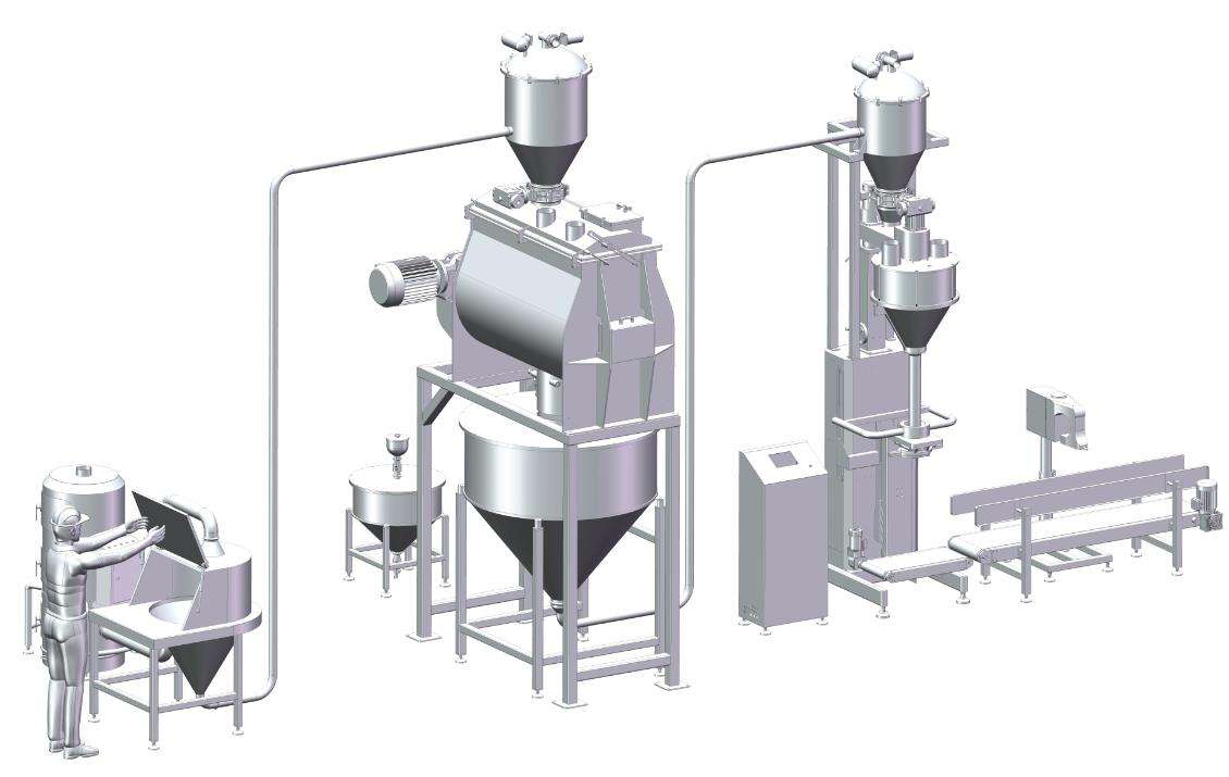 當小袋物料需要拆包倒入下道工序時,隻需人工直接拆包放入係統即可。給料過程中產生的物料粉塵由除塵風機收集。物料通過振動篩(安全篩)攔截散狀物料和異物,保證符合要求的顆粒順利輸入。