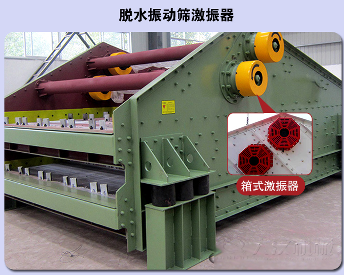 脫水振動篩箱近似於香蕉形狀,篩梁采用箱形梁,該振動篩傳動係統由電動機通過帶輪、三角帶,再由萬向連接軸傳遞給激振器.激振器之間由中間傳動軸連接。支撐裝置為12個鋼彈簧支撐。該振動篩具有處理能力大,篩分效率高,能耗小,事故率低等特點。