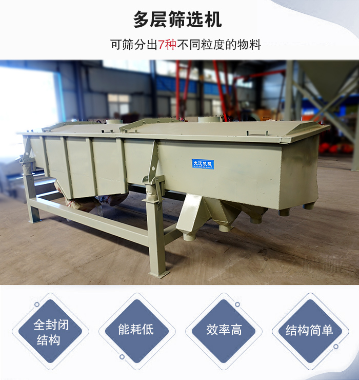 具有能耗低、效率高、結構簡單、易維修、全封閉結構無粉塵溢散的特點。最高篩分目數 400目,可篩分出7種不同粒度的物料。