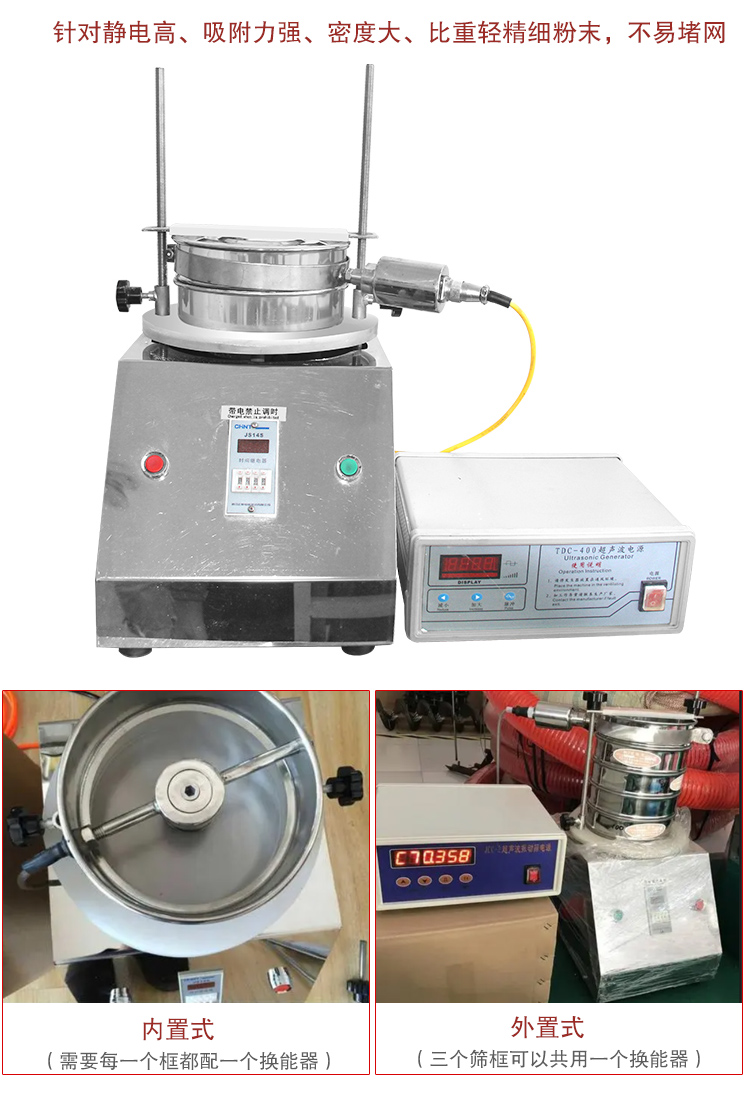 在標準檢驗篩基礎上增加了超聲波篩分係統,解決了篩分200目以上高目數產品或普通檢驗篩難以篩分的易結塊、易帶靜電的產品的難題,並防止篩網堵塞。