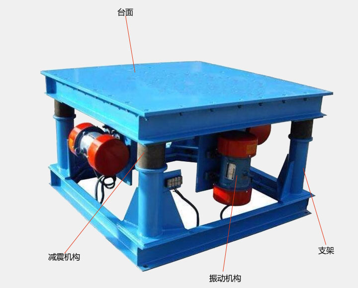 1、 高頻振動平台主要有支架、台麵、振動機構,減震機構四部分組成。在振動機構的帶動下做橫向、縱向、上下等三維振動,故而得名。