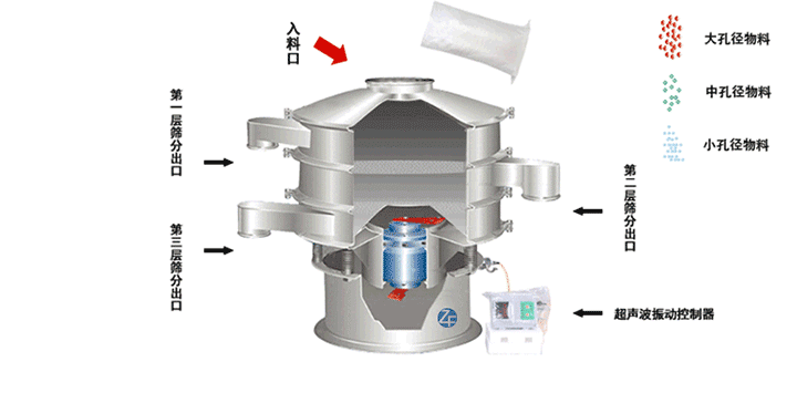 超聲波振蕩篩在直立式振動電機與超聲波換能器的共同作用下,實現物料的篩分/分級目的。直立式振動電機作zuo為wei激ji振zhen源yuan,帶dai動dong物wu料liao和he篩shai網wang的de振zhen動dong的de同tong時shi,超chao聲sheng波bo換huan能neng裝zhuang置zhi實shi現xian對dui物wu料liao靜jing電dian,易yi聚ju團tuan的de抑yi製zhi,保bao證zheng物wu料liao的de鬆song散san從cong而er實shi現xian物wu料liao的de篩shai分fen目mu的de。
