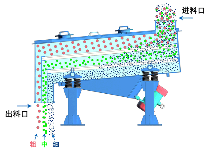 直zhi線xian篩shai依yi靠kao兩liang個ge相xiang同tong頻pin率lv的de反fan向xiang電dian機ji使shi物wu料liao在zai篩shai麵mian上shang直zhi線xian向xiang前qian跳tiao躍yue,小xiao於yu篩shai孔kong孔kong徑jing的de物wu料liao通tong過guo篩shai網wang落luo入ru下xia層ceng,將jiang原yuan本ben雜za亂luan無wu章zhang的de顆ke粒li分fen離li,即ji按an粒li度du分fen層ceng,形xing成cheng底di部bu小xiao顆ke粒li、頂部粗顆粒的排列,從而達到對物料進行篩分和分級的目的
