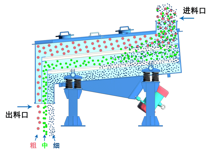 kuangyongzhendongshaishitongguofenlibutongchicundecailiaoyijicongbuxuyaodechicunguoxiaodekelizhongquchucaikuangcailiaodefenchenlaigaijincaikuangcailiaodegongyi,youshaiwanghequdongxitongzucheng,gaishaiwangjiangxikeliyucukelifenli,qudongxitongchanshengbiyaodezhendonghuoxuanzhuan,yibianzaishaibanshangyidong、鬆散和運輸篩分材料。