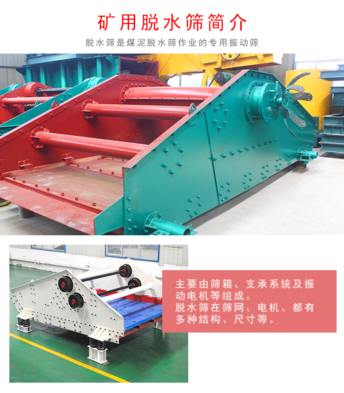 礦用脫水篩是煤泥脫水作業的專用振動篩,它廣泛適用於選煤、電力、選礦、製鹽、化工、製糖等行業中的細粒度幹式、濕式篩分煤泥回收,過濾隔粗、壓濾隔粗、其他極細物料的脫水、過濾隔粗脫水、脫介、脫泥回收等工藝中。