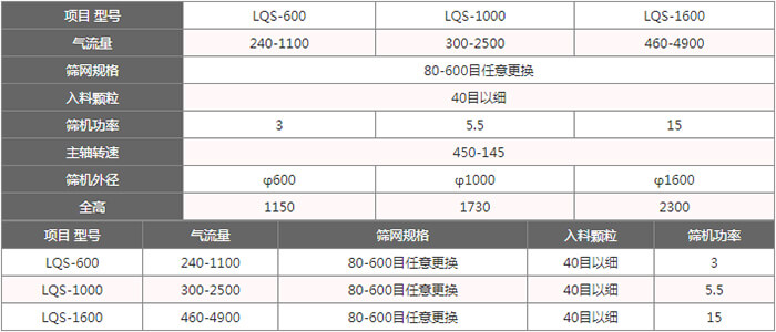 氣流篩篩分效率高、產量大,細度、無超徑混級現象,篩網立裝不荷重、使用壽命長,適應細度範圍廣,全封閉結構,無粉塵溢散,噪音小能耗低、可連續作業,維修方便。