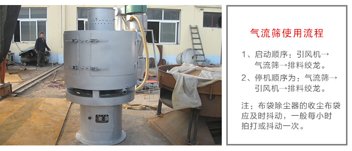 氣流篩篩分效率高、篩網立裝不荷重。適應細度範圍廣,全封閉結構,噪音小能耗低、可連續作業。