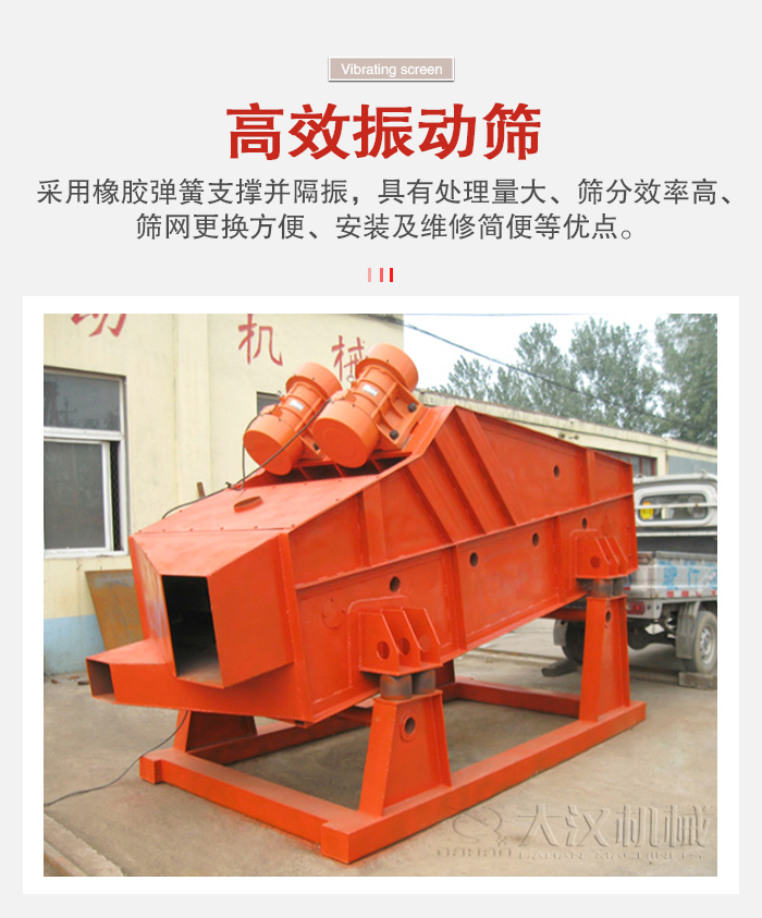 高效振動篩是我公司自行研製的一種新型、高效的篩分設備,廣泛應用於冶金行業,是高爐槽下、焦化廠、選礦廠常用的篩分機械。該機采用新型振動電機或激振器作振動源,采用橡膠彈簧支撐並隔振,具有處理量大、篩分效率高、篩網更換方便、安裝及維修簡便等優點。