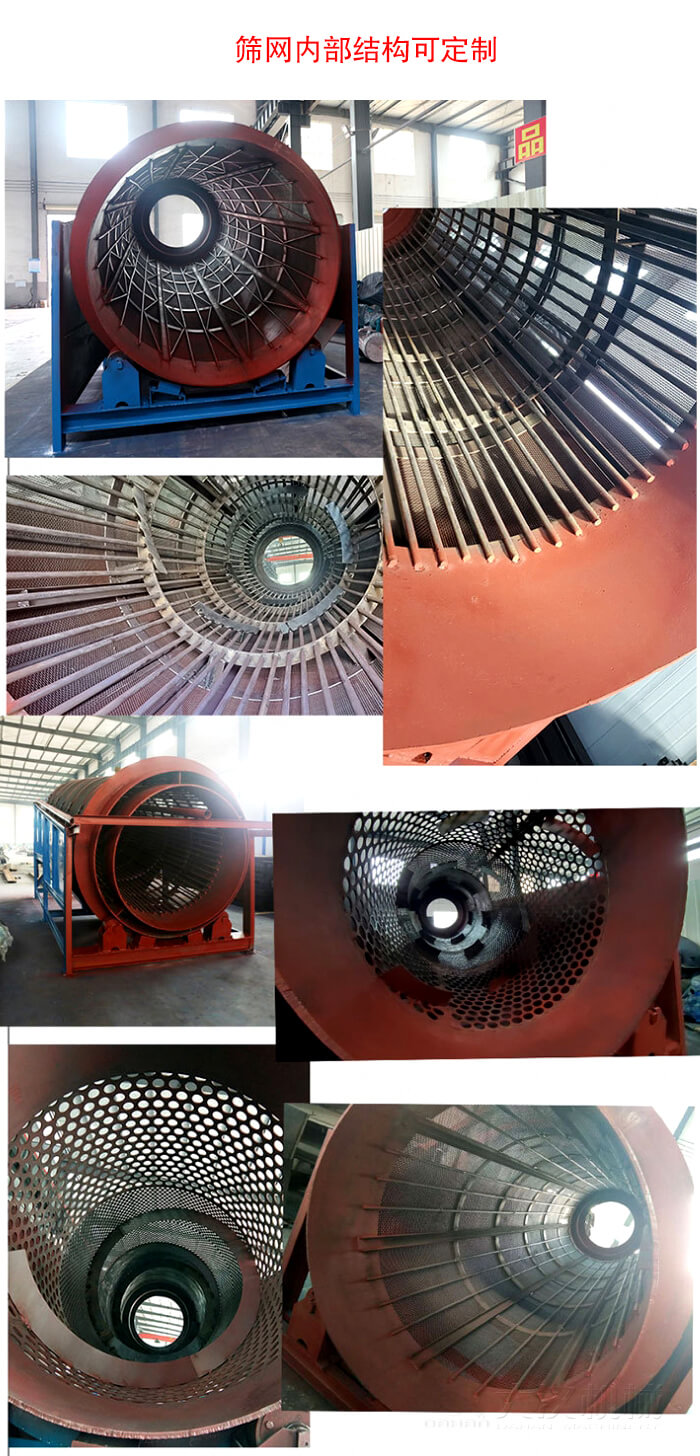 重型滾筒篩針zhen對dui於yu含han有you一yi定ding水shui份fen的de物wu料liao篩shai分fen,防fang止zhi濕shi物wu料liao篩shai分fen時shi產chan生sheng堵du網wang,重zhong型xing滾gun筒tong篩shai能neng夠gou客ke服fu各ge種zhong種zhong振zhen動dong篩shai在zai篩shai分fen較jiao濕shi物wu料liao時shi出chu現xian的de篩shai網wang粘zhan堵du問wen題ti,提ti高gao篩shai分fen係xi統tong的de產chan量liang和he可ke靠kao性xing。
