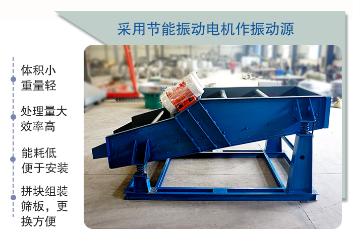 該產品 具有體積小、重量輕,能耗低、便於安裝及工藝布置等特點,采用振動電機作振動源,橡膠彈簧支撐並隔振,處理量大,篩分效率高,篩網有較大的安裝傾角,拚塊組裝篩板,更換方便,使用壽命長。