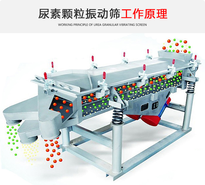尿素顆粒振動篩主要由篩箱、篩框、篩網、振動電機、電機台座、減振彈簧、支架等組成。
