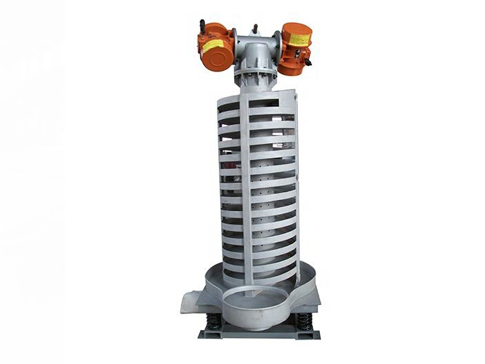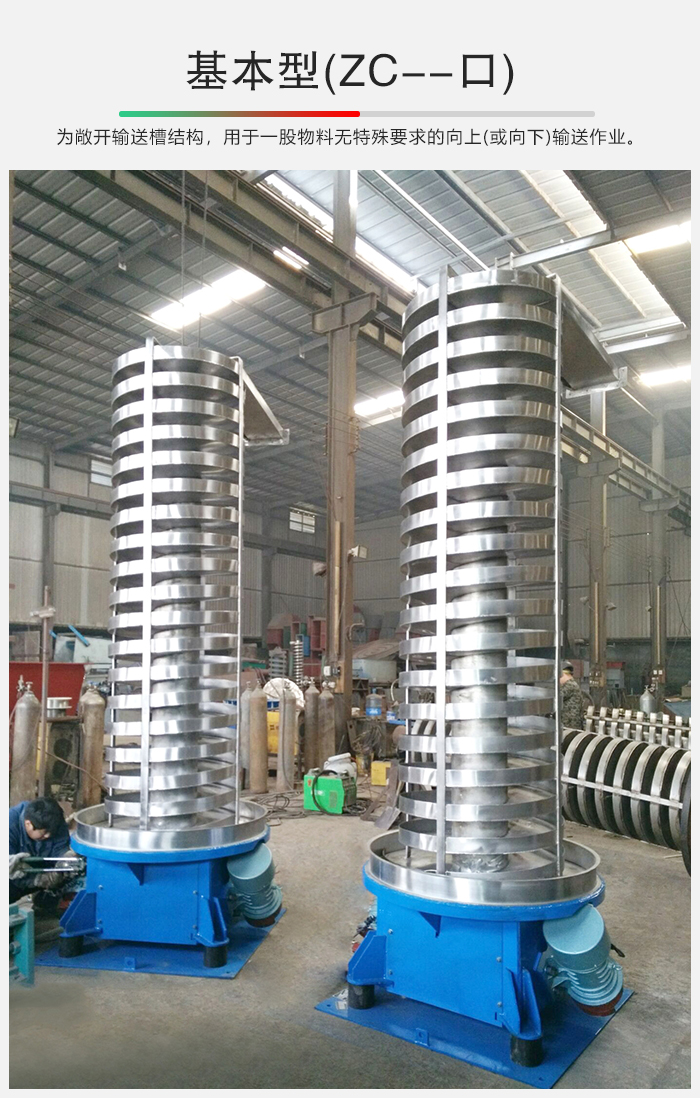 SZC係xi列lie垂chui直zhi振zhen動dong提ti升sheng機ji的de驅qu動dong裝zhuang置zhi振zhen動dong電dian機ji安an裝zhuang在zai輸shu送song塔ta下xia部bu,兩liang台tai振zhen動dong電dian機ji對dui稱cheng交jiao叉cha安an裝zhuang,輸shu送song塔ta由you管guan體ti和he焊han接jie在zai管guan體ti周zhou圍wei的de螺luo旋xuan輸shu送song槽cao組zu成cheng,輸shu送song塔ta座zuo於yu減jian振zhen裝zhuang置zhi上shang,減jian振zhen裝zhuang置zhi由you底di座zuo和he隔ge振zhen彈dan簧huang組zu成cheng。當dang垂chui直zhi輸shu送song機ji工gong作zuo時shi,根gen據ju雙shuang振zhen動dong電dian機ji自zi同tong步bu原yuan理li,由you振zhen動dong電dian機ji產chan生sheng激ji振zhen力li,強qiang迫po整zheng個ge輸shu送song塔ta體ti作zuo水shui平ping圓yuan運yun動dong和he向xiang上shang垂chui直zhi運yun動dong的de空kong間jian複fu合he振zhen動dong,螺luo旋xuan槽cao內nei的de物wu料liao則ze受shou輸shu送song槽cao的de作zuo用yong,作zuo勻yun速su拋pao擲zhi圓yuan運yun動dong,沿yan輸shu送song槽cao體ti向xiang上shang運yun動dong,從cong而er完wan成cheng物wu料liao的de向xiang上shang(或向下)輸送作業。